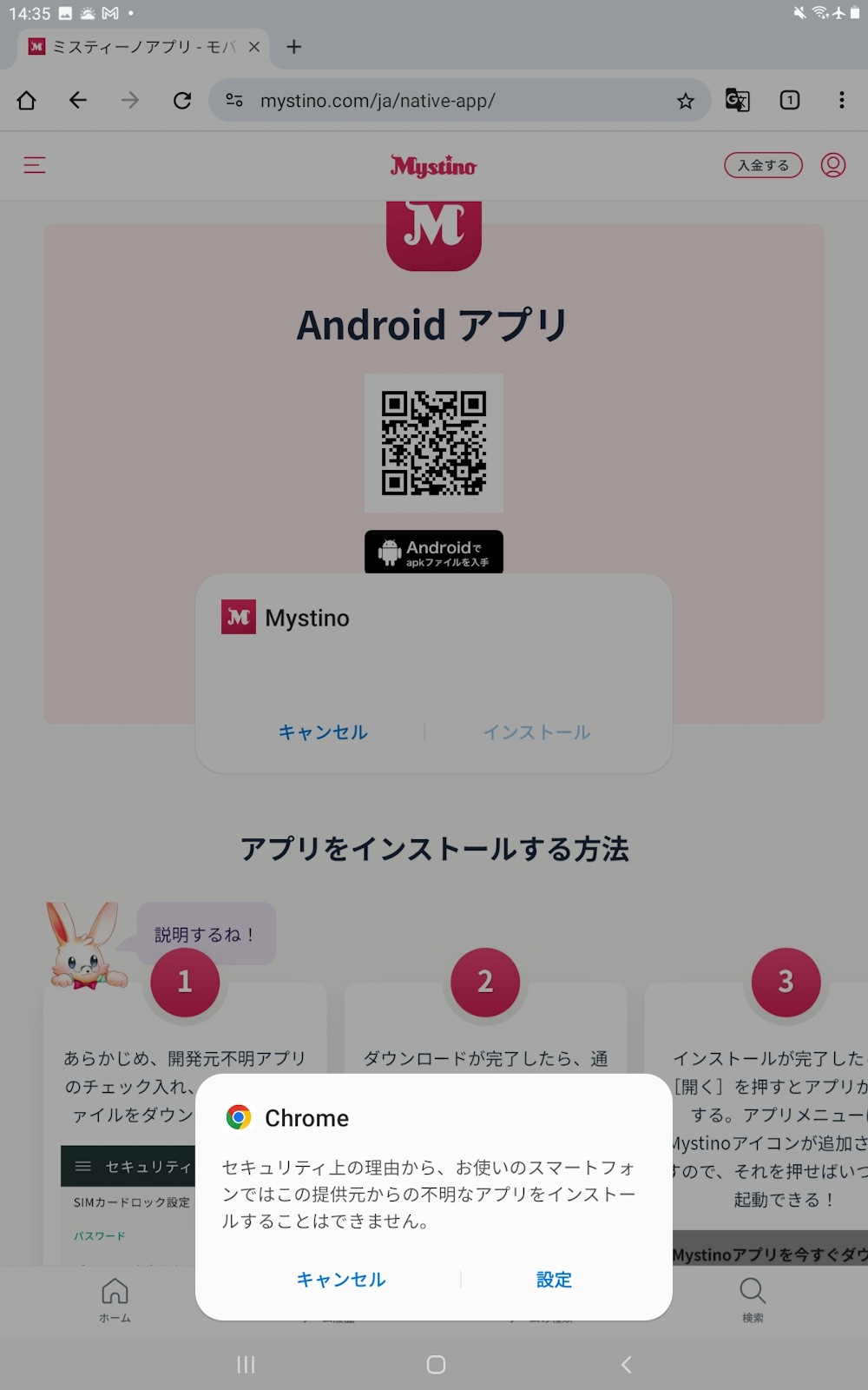 アンドロイド端末用のミスティーノアプリは、公式サイトから APK ファイルをダウンロードしてからインストール可能です。グーグルプレイストア外からのアプリをインストールするので、アンドロイド端末の設定を少し変更する必要があります。