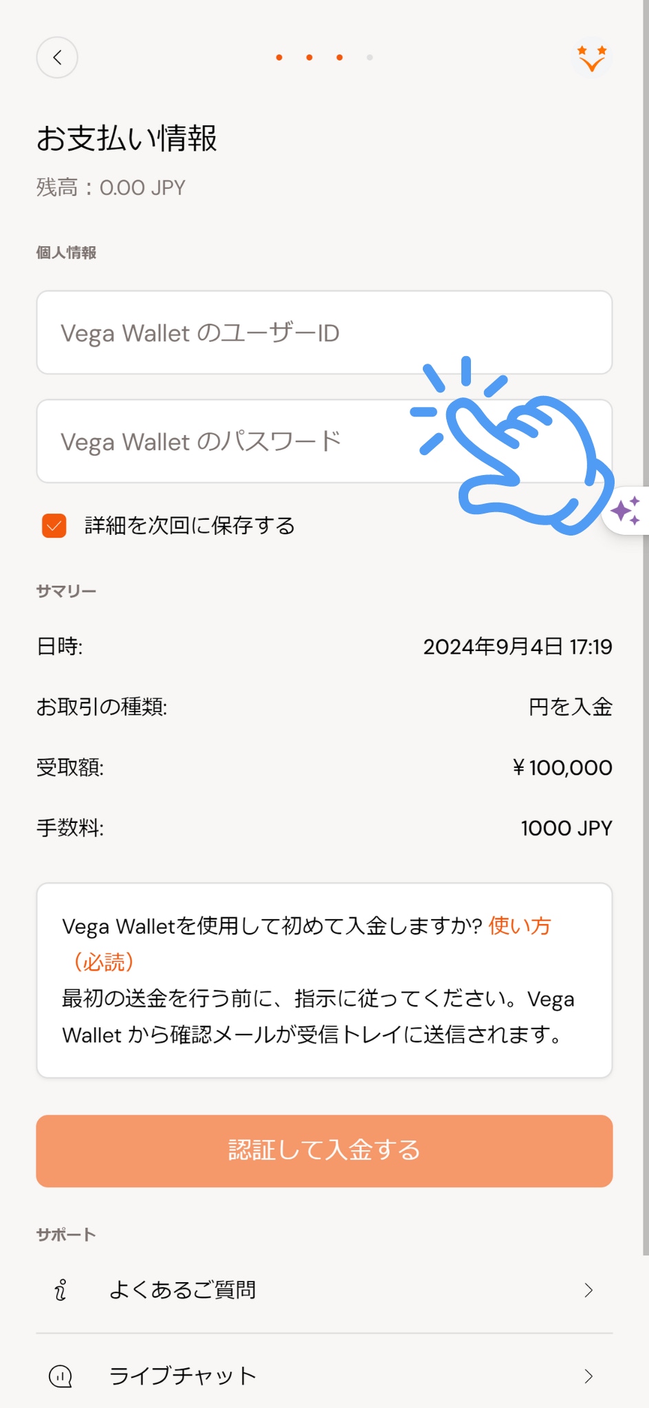 ビットカジノにベガウォレットで入金する手順を以下にまとめました。